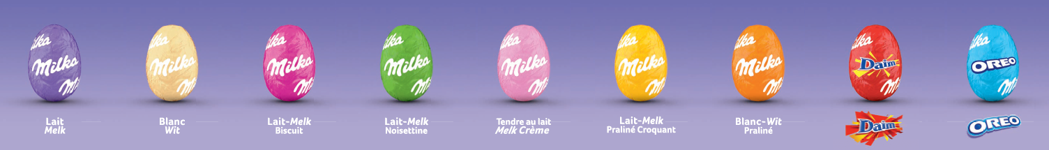 Il n'y a aucun doute : Milka est le favori absolu en matière de chocolat de Pâques et détient une part de marché de 35% en Belgique pendant cette période. De plus, les consommateurs semblent avoir une nette préférence pour les petits œufs de Pâques (69%). Ici aussi, Milka est en tête avec 49% du volume2. Avec leurs 9 couleurs et saveurs différentes, les œufs Milka savent convaincre tous les amateurs de chocolat : œufs pleins, praliné, ou encore fourrés Oreo ou Daim, ... il y en a pour tous les goûts. Cette année, les traditionnels œufs en chocolat au lait sont les œufs les plus vendus, suivis des œufs chocolat au lait praliné. Les œufs en chocolat au lait fourrés Oreo se trouvent en troisième position.